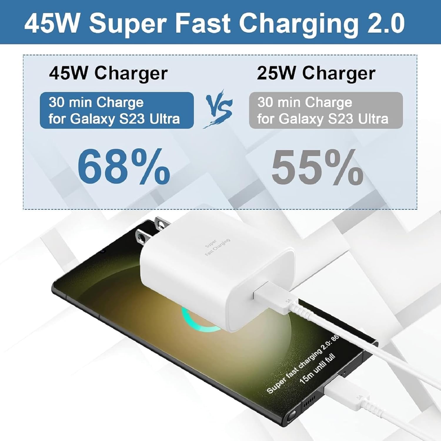 - 45W Super Fast Charger 3.0,utilizes advanced Power Delivery (PD) technology to deliver a maximum output of 45W, providing an efficient and rapid charging experience. It can charge the Samsung Galaxy S25/S24 Ultra from 0% to 50% in just 20 minutes, significantly faster than standard 25W or 15W chargers.